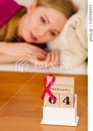 Woman on bed, world breast cancer day on calendar