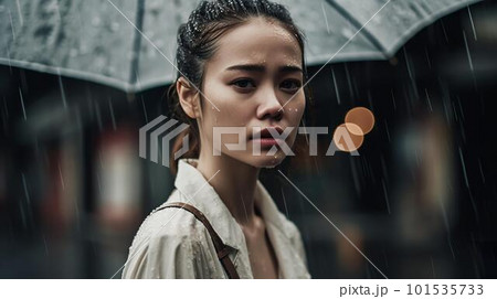 雨の中、悲しそうな表情の女性(失恋・絶望・悲しい・Generative AI)
