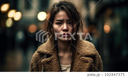 スラム街でレイプ・貧困に悩む悲しそうな表情の女性(失恋・絶望・悲しい・Generative AI)