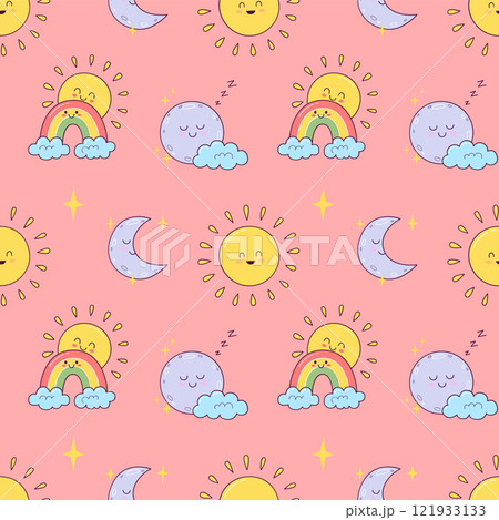 Cute seamless pattern with kawaii clouds, rainbow, and stars. pattern for fabric, wallpaper, wrapping paper, kids apparel, baby product.