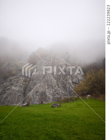 Ethereal foggy morning with wooden fence in a countryside landscape