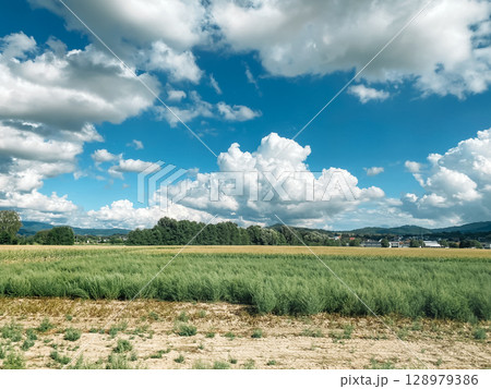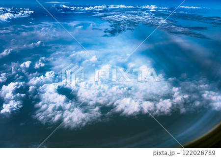 Aerial view from airplane window above green ground. View from the airplane window with beautiful clouds at sunrise. Earth and sky as seen through window of an airplane. High quality photo