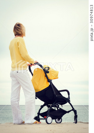 Mother looking through the sea while walking with