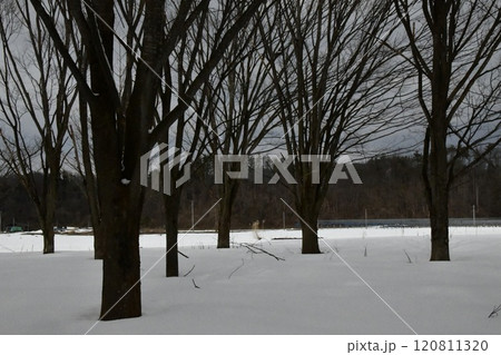 雪が降り積もった中に佇んでいる葉の落ちた木々