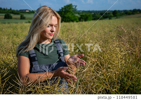 Farmer Examines Ripening Rapeseed Pods in a Lush Green Field Under a Blue Sky with Village in the Background