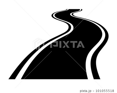 蛇行した一本道の先が行き先不明となっている道路、交通標識のイラスト