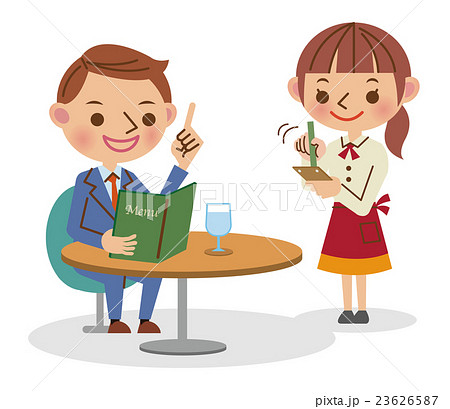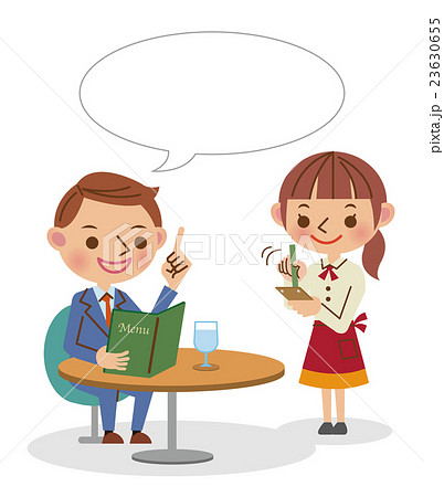 カフェでメニューを見ながら注文するビジネスマンと注文を書き留めるウェイトレス(フキダシあり)