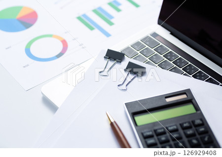 クリップで挟んだ書類とグラフと電卓とパソコン