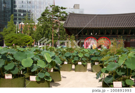 1395年に創建された曹渓宗の総本山、曹渓寺(チョゲサ)敷地内に数多くの蓮の鉢が並んでいる