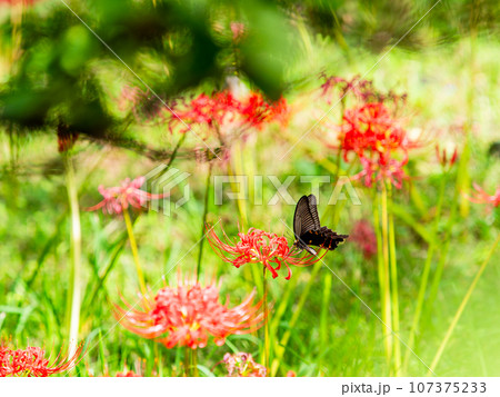 満開の彼岸花の蜜を吸うアゲハチョウ