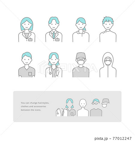 着せ替え可能な、シンプルな線画で描かれた、医療従事者の人物アイコンセット