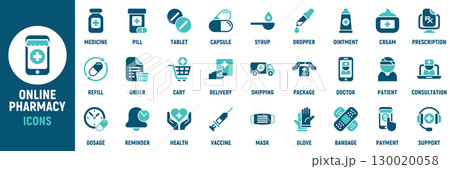 Online pharmacy icon set. Containing pill, tablet, capsule, prescription, order, cart, delivery, package, doctor, patient and more. Solid vector icons collection