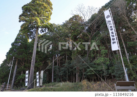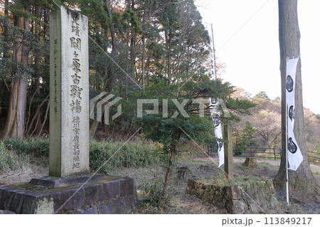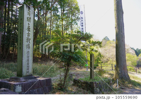 桃配山徳川家康陣地の石柱とのぼり旗を見る風景