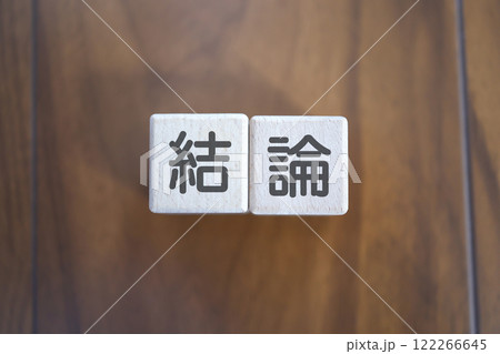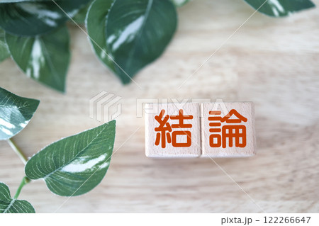 木のブロックに結論と書いている