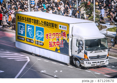 日本の東京都市景観死者4千人超え第5波を上回る…。ピークアウトの妄想…渋谷を走る宣伝カー=2月23日
