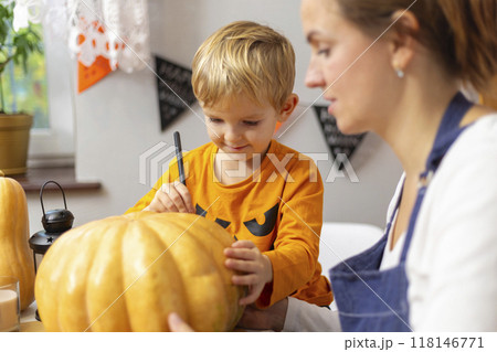 Child carving pumpkin with parent for Halloween