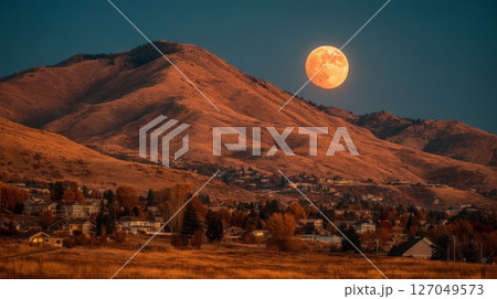 Orange Full Moon Over Autumn Hills at Dusk