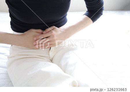 ソファに座ってお腹をおさえるミドルエイジの女性 腹痛