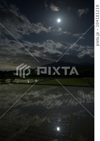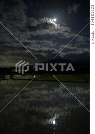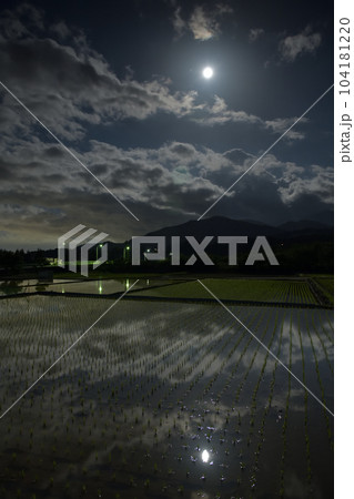 北杜市白州町、月齢14.5小望月映す田植えの済んだ田んぼ