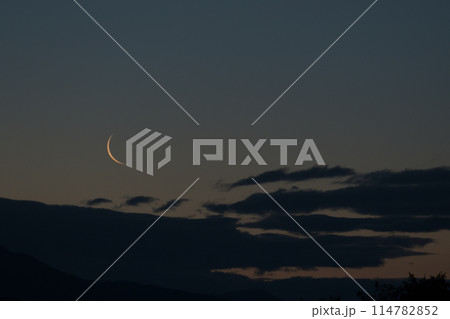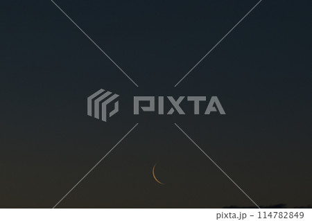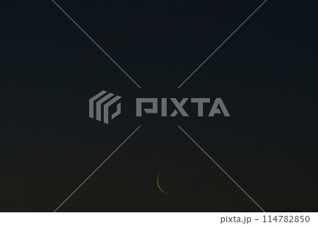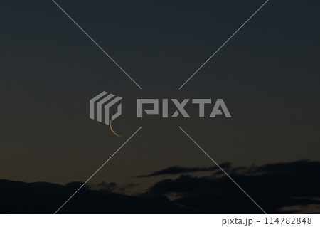 北杜市長坂町、夜明けの空に月齢27.7逆三日月、有明の月、細い月
