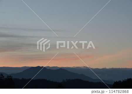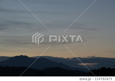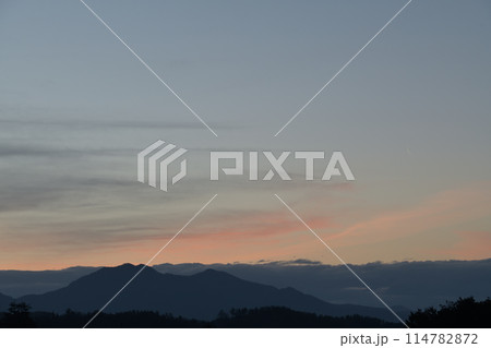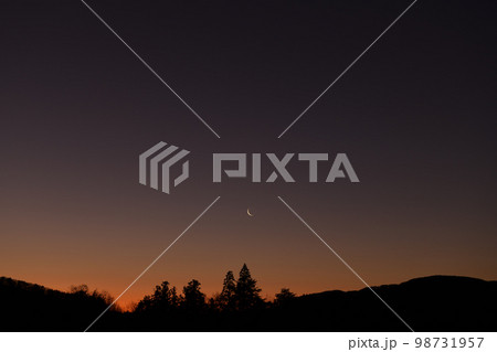 北杜市白州町、黎明の空に月齢27.7有明の細い月が昇る