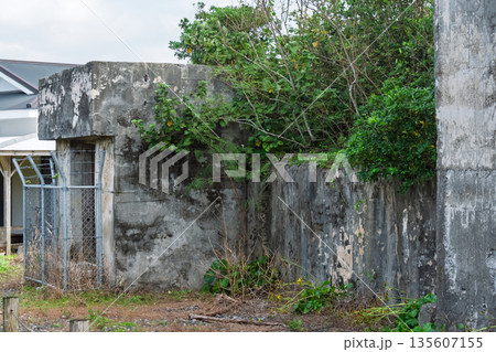 太平洋戦争の軍事遺構、劣化し風化したコンクリート造の戦闘指揮所跡(負の遺産・歴史資料)