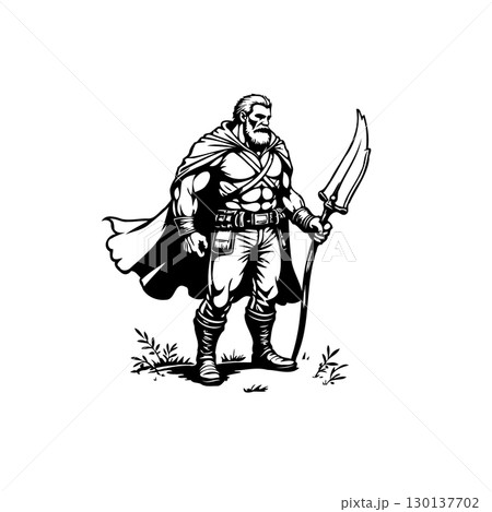 Powerful bearded hero with flowing cape and weapon, standing tall in a stylized illustration