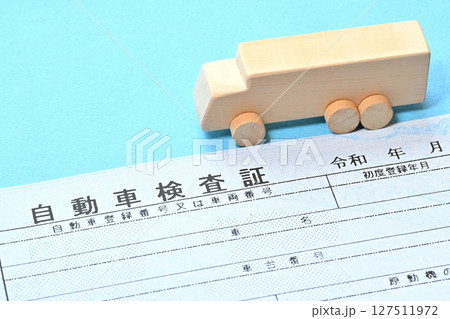 電子車検証とリフトに載せられた大型自動車のイメージ
