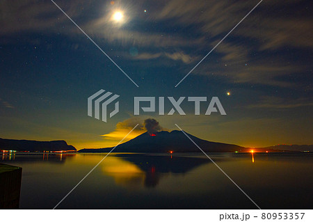 幻想的な雰囲気の月夜とあいらカルデラ湖と噴火する桜島