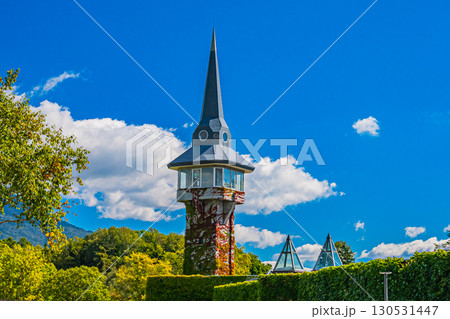 冬の有島記念公園の有島記念館の塔を臨む