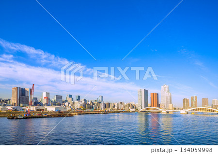 日本の東京都市景観 築地市場跡地再開発・解体工事「都有地(築地地区)活用に向けた準備工事」などを望む