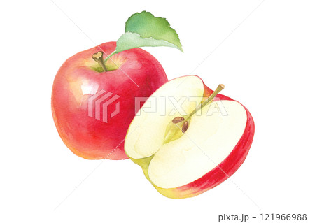 フレッシュな赤いリンゴの水彩イラスト。ホールとカットの組み合わせ