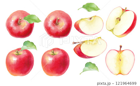 フレッシュな赤いリンゴの水彩イラスト。ホールとカットのアソート。