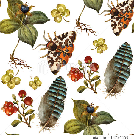 Plant, berry and moth pattern watercolor illustration. Hand painted watercolor on white background.