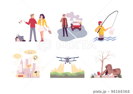 Environmental pollution concept. Water and air pollution from industrial and plastic waste cartoon vector illustration