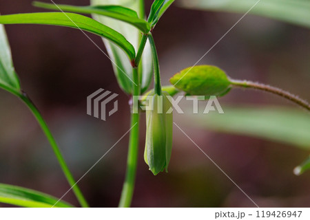 雑木林などの樹間の開けた場所に群生してアマドコロに似た花を咲かせるホウチャクソウ