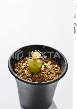 小さな黄色い花をつけたコノフィツムの鉢植え