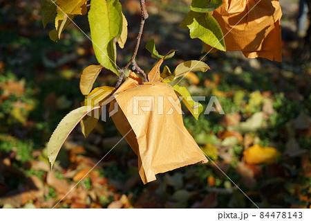 収穫期の梨園の有袋栽培の梨とセミの抜け殻