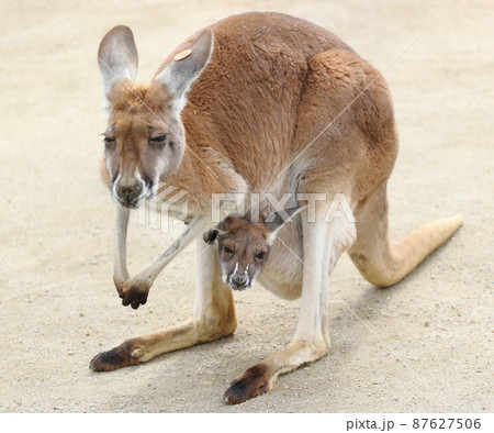 子供が袋に入る親子のカンガルー