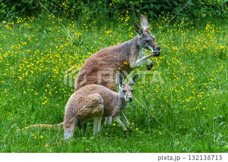 Wild Eastern grey kangaroo and adorable joey at sunset, Australia