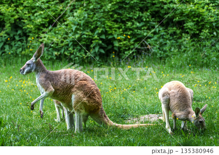 wallabies (Notamacropus rufogriseus) standing on green grass