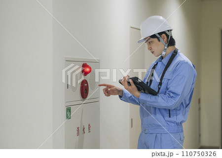 消火器の点検をする作業服の男性 ビルメンテナンス イメージ
