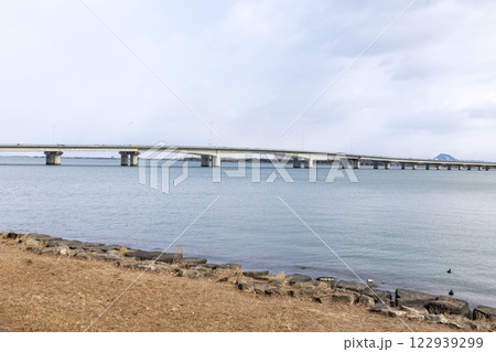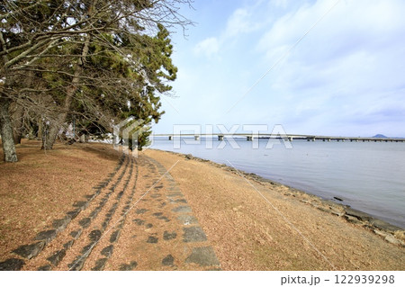 大津市、膳所城址公園から眺める近江大橋と近江富士(三上山)