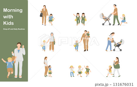 保育園・幼稚園に登園する親子のイラストセット(朝の支度・登園シーン)