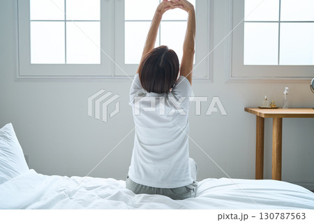 朝日を浴びる女性の目覚めシーン(室内・カーテンを開ける)