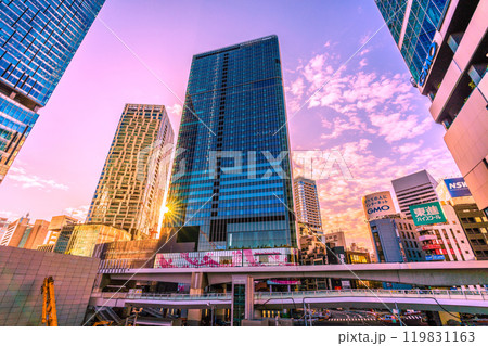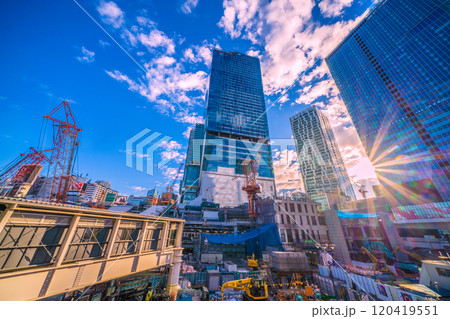 日本の東京都市景観 朝日が差し込む渋谷の街やビル群などを望む。さよなら渋谷駅西口…希望の光=9日