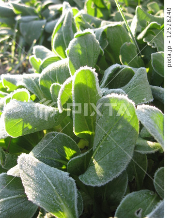 冬の背景素材・朝霜に縁どられる野草(スイバ?)の葉・縦位置