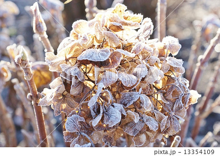 冬の風景・朝霜を留める天然のドライフラワー「秋色紫陽花」・横位置