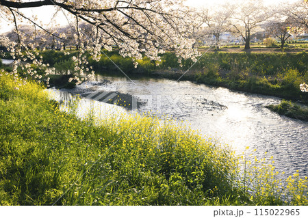 川沿いに咲く菜の花と桜の木