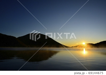 千手ヶ浜から霧立つ中禅寺湖に倒影する男体山と日の出